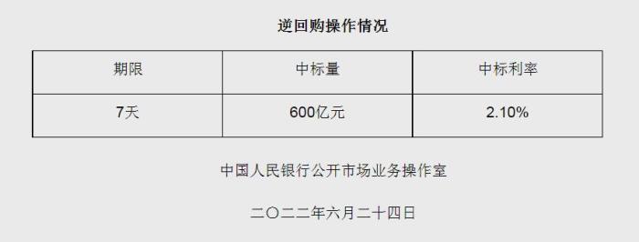 - 央行6月24日開展600億元逆回購操作 中標(biāo)利率2.10%