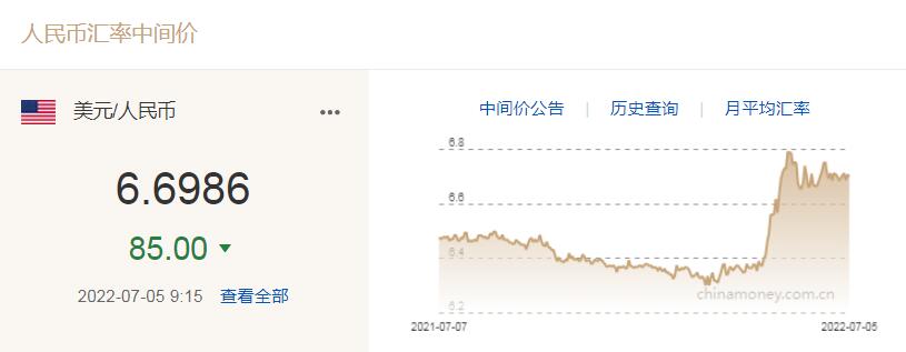 人民幣兌美元中間價報6.6986,上調(diào)85個基點
