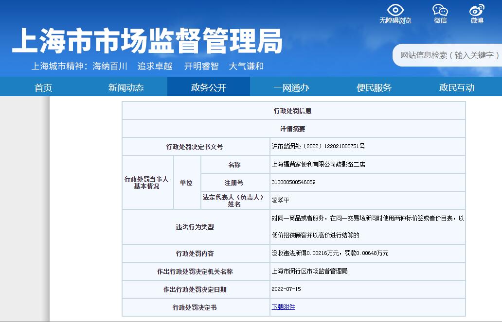 中新網(wǎng)7月27日電 上海市市場監(jiān)督管理局網(wǎng)站顯示,近日,上海福滿家便利有限公司疏影路二店,因?qū)ν簧唐坊蛘叻?wù),在同一交易場所同時使用兩種標(biāo)價簽或者價目表,以低價招徠顧客并以高價進行結(jié)算,被上海市閔行區(qū)市場監(jiān)督管理局沒收違法所得21.6元、罰款64.8元。