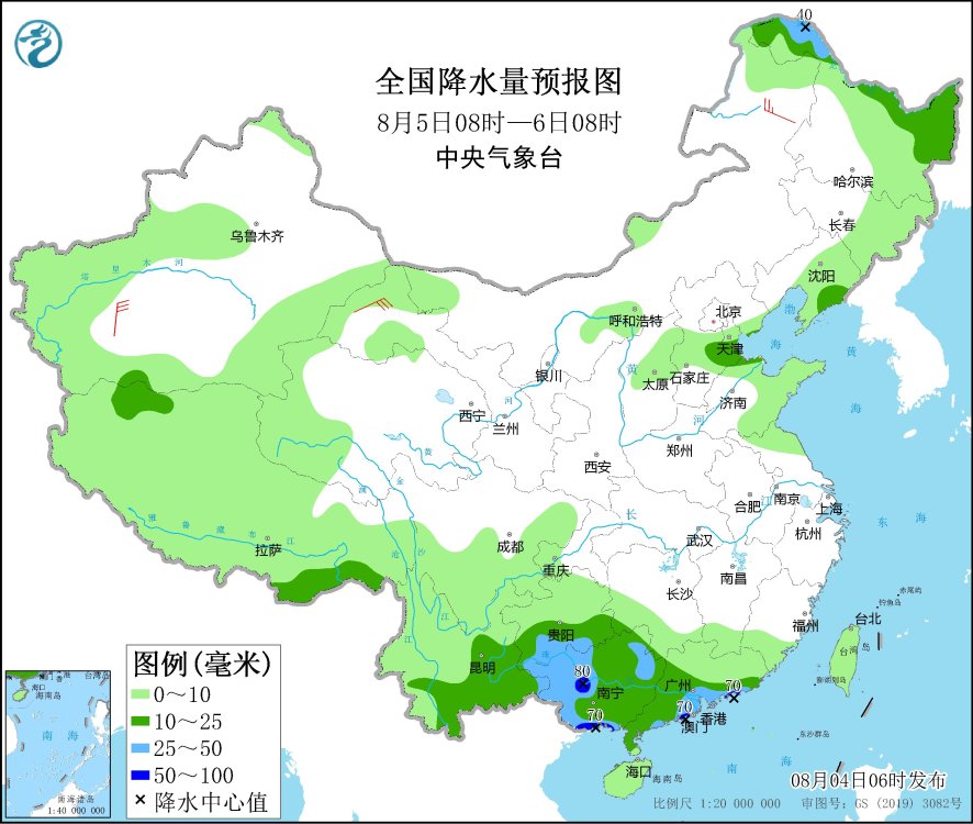 8月5日08時(shí)至6日08時(shí),黑龍江北部、廣東中西部、廣西、貴州南部、云南中東部、西藏東南部等地部分地區(qū)有中到大雨,其中,廣東南部沿海、廣西西南部等地局部地區(qū)有暴雨(50~80毫米)。甘肅西部、內(nèi)蒙古東北部、新疆南疆盆地等地部分地區(qū)有4~6級(jí)風(fēng)。