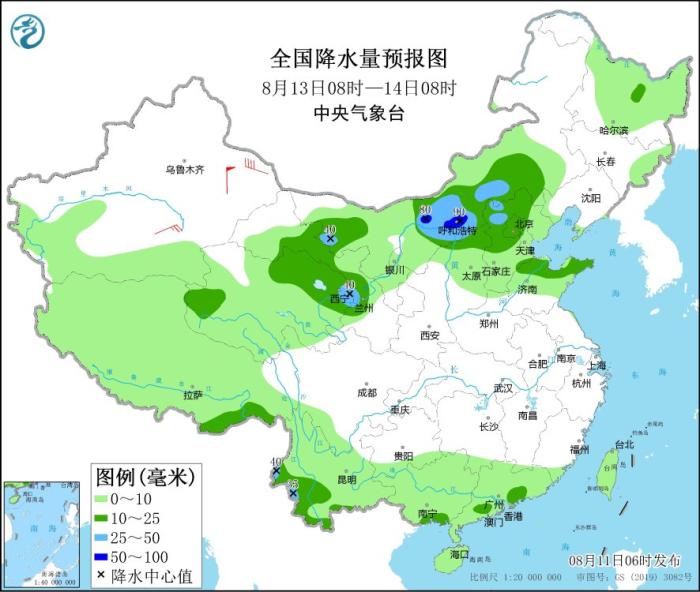 8月13日08時至14日08時,內(nèi)蒙古中西部和東南部、西藏東南部、甘肅中部、青海東北部、華北中北部、山東北部、云南南部等地部分地區(qū)有中到大雨,其中,內(nèi)蒙古河套地區(qū)等地局地有暴雨(50~90毫米)。新疆東部和南疆盆地部分地區(qū)有4~6級風(fēng)。