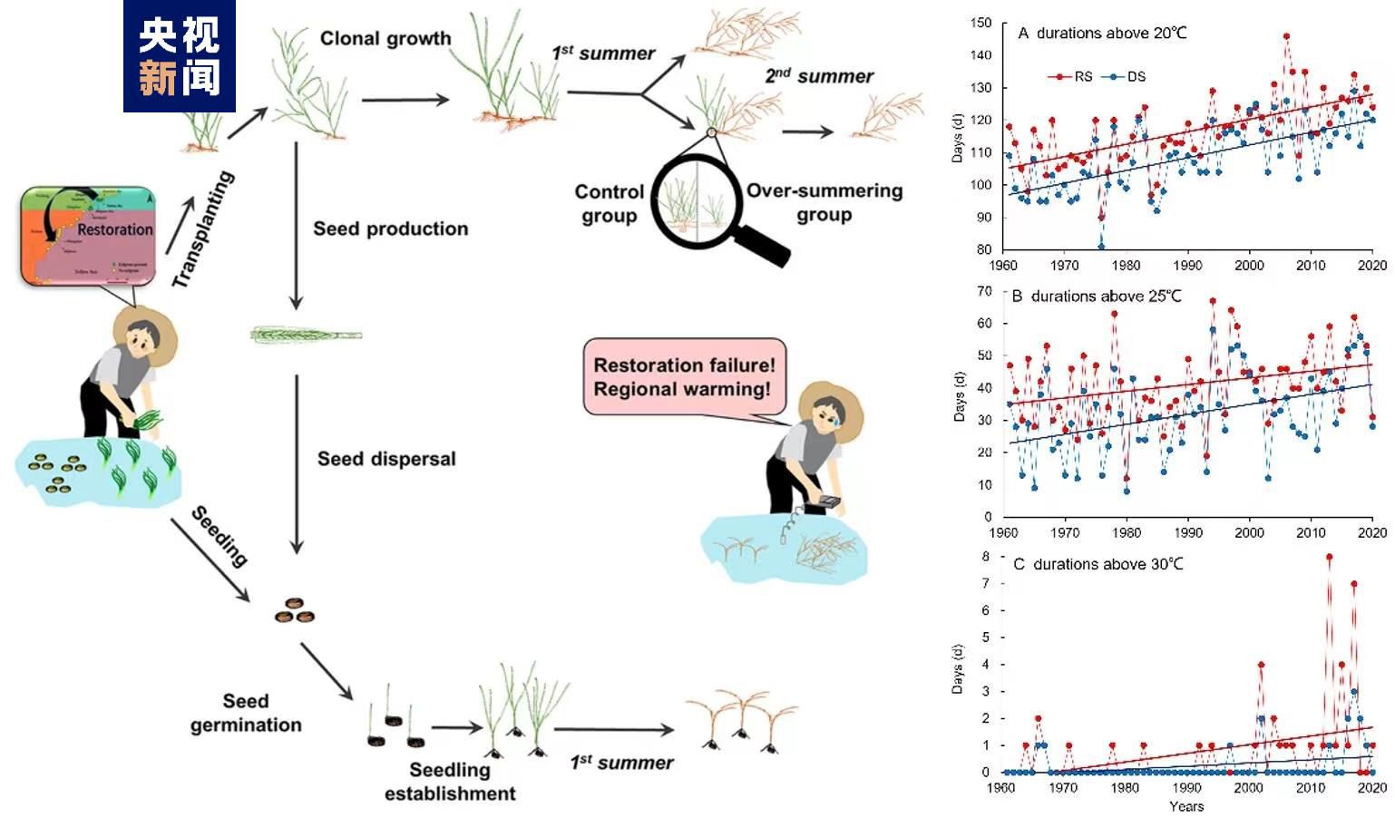 為確定鰻草地理分布北移是否由區(qū)域變暖所致,2016年至2021年期間,科研人員從青島灣獲取鰻草植株和種子,在日照石臼所海域共開展了16次鰻草植株移植和種子種植實驗,監(jiān)測海草生長狀況及水溫等環(huán)境參數(shù),并進行海草生化分析和轉(zhuǎn)錄組分析。