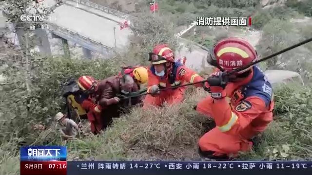 繩橋搭建完成后,消防員徒步跨過阻擋在道路中央的石塊,將小孩和病情危重的老人進行轉(zhuǎn)移。