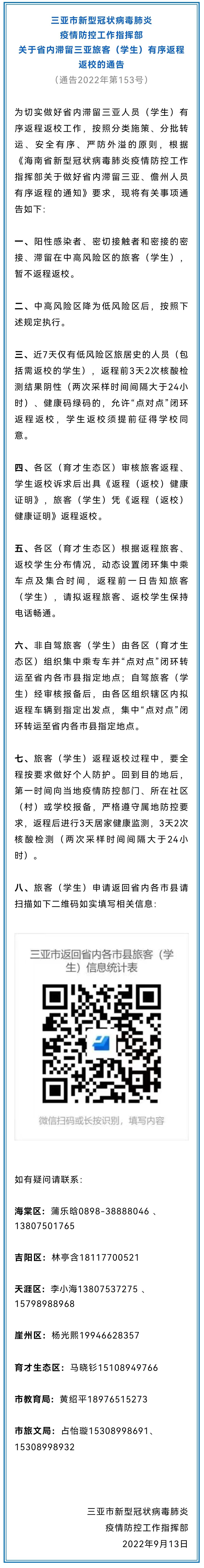 9月13日,總臺記者從三亞市新型冠狀病毒肺炎疫情防控工作指揮部獲悉, 為切實(shí)做好海南省內(nèi)滯留三亞人員(學(xué)生)有序返程返校工作,按照分類施策、分批轉(zhuǎn)運(yùn)、安全有序、嚴(yán)防外溢的原則,根據(jù)《海南省新型冠狀病毒肺炎疫情防控工作指揮部關(guān)于做好省內(nèi)滯留三亞、儋州人員有序返程的通知》要求,現(xiàn)將有關(guān)事項(xiàng)通告如下: