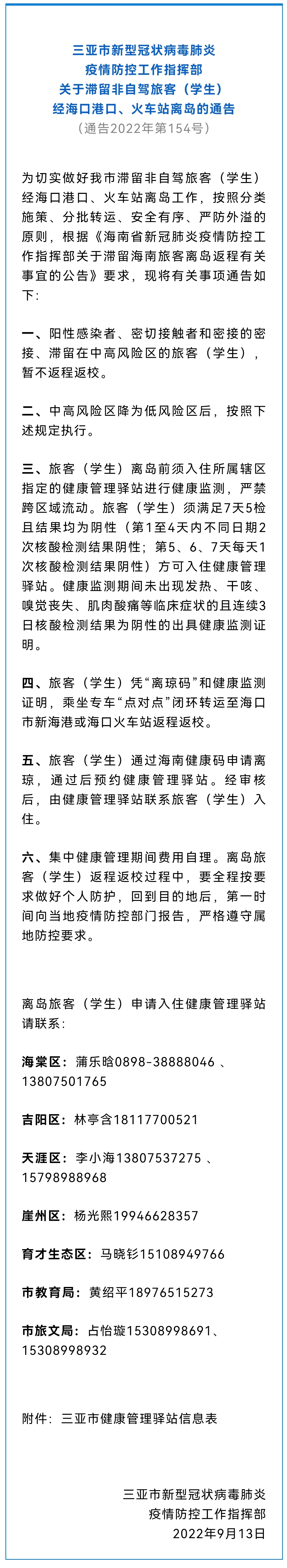 9月13日,總臺記者從三亞市新型冠狀病毒肺炎疫情防控工作指揮部獲悉,為切實(shí)做好三亞市滯留非自駕旅客(學(xué)生)經(jīng)??诟劭?、火車站離島工作,按照分類施策、分批轉(zhuǎn)運(yùn)、安全有序、嚴(yán)防外溢的原則,根據(jù)《海南省新冠肺炎疫情防控工作指揮部關(guān)于滯留海南旅客離島返程有關(guān)事宜的公告》要求,現(xiàn)將有關(guān)事項(xiàng)通告如下: