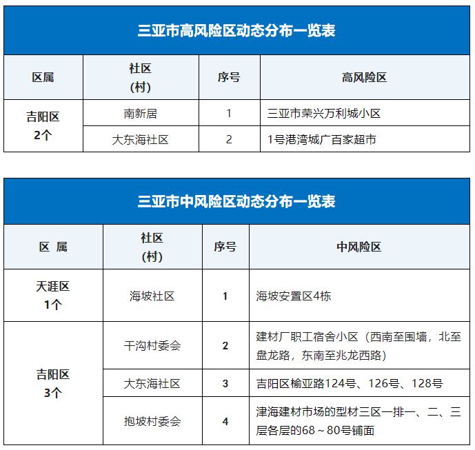 9月19日,記者從海南省三亞市新型冠狀病毒肺炎疫情防控工作指揮部獲悉,根據(jù)當前三亞市疫情防控工作需要,按照國務(wù)院應(yīng)對新型冠狀病毒肺炎疫情聯(lián)防聯(lián)控機制綜合組《新型冠狀病毒肺炎防控方案(第九版)》相關(guān)規(guī)定,經(jīng)專家組研判,三亞市疫情防控指揮部決定,將紅旗街社區(qū)椰風巷79、81、83號樓等區(qū)域調(diào)整為低風險區(qū),自通告發(fā)布起,高風險區(qū)調(diào)整為2個、中風險區(qū)調(diào)整為4個(見附表)。除高、中風險區(qū)外的區(qū)域為低風險區(qū)。