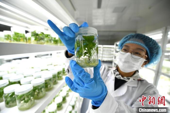 在河北中薯農(nóng)業(yè)科技集團股份有限公司甘薯脫毒組培中心,技術員查看脫毒苗生長情況?!∴嵆孔?攝