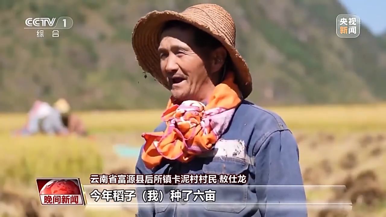 云南省富源縣后所鎮(zhèn)卡泥村村民 敖仕龍:今年稻子種了六畝,一畝收得到二十口袋,這個(gè)稻子比去年飽滿(mǎn),比去年稱(chēng)得出來(lái)(重),價(jià)格也比去往年好點(diǎn)。