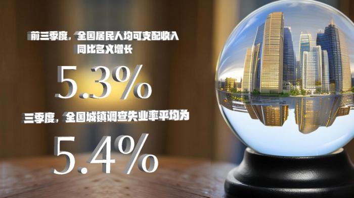 就業(yè)形勢(shì)總體穩(wěn)定,居民收入平穩(wěn)增長(zhǎng)。前三季度,全國(guó)城鎮(zhèn)調(diào)查失業(yè)率平均為5.6%,其中三季度平均為5.4%,比二季度下降0.4個(gè)百分點(diǎn)。全國(guó)居民人均可支配收入27650元,同比名義增長(zhǎng)5.3%;扣除價(jià)格因素實(shí)際增長(zhǎng)3.2%,比上半年加快0.2個(gè)百分點(diǎn);全國(guó)居民人均可支配收入中位數(shù)23277元,同比名義增長(zhǎng)5.1%。