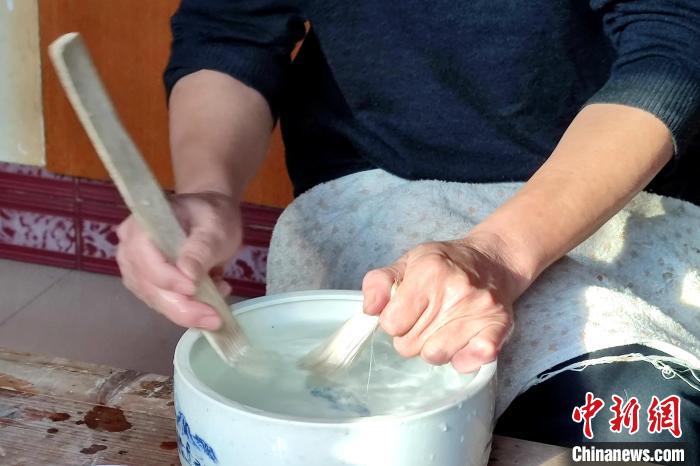 在水中反復(fù)梳洗毛筆頭是制筆的重要環(huán)節(jié)。 吳冠標(biāo) 攝