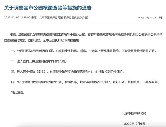 關(guān)于調(diào)整全市公園核酸查驗等措施的通告。 北京市園林綠化局官網(wǎng) 攝
