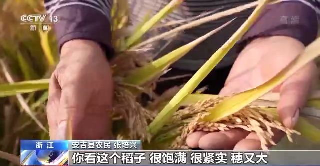 浙江省安吉縣農(nóng)民 張培興:你看這個稻子,很飽滿、緊實,穗又大,稻子千粒重也比往年要重。已經(jīng)到達我的預期了,我很開心。