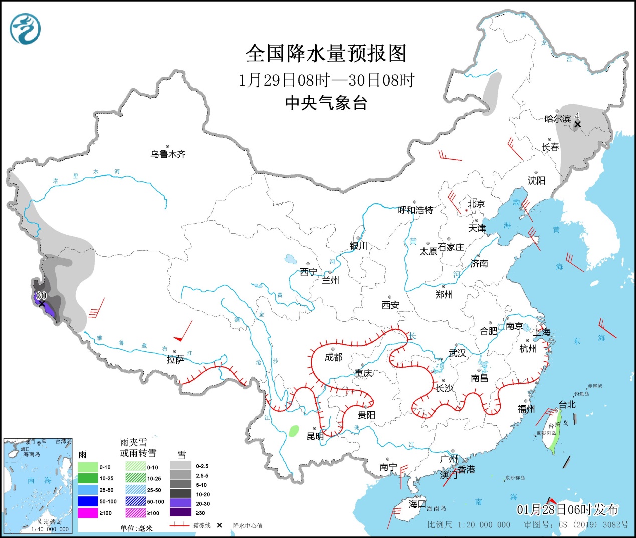 全國降水量預(yù)報(bào)圖(1月28日08時(shí)-29日08時(shí))。圖片來源:中央氣象臺(tái)網(wǎng)站