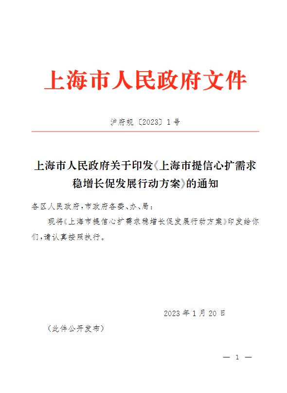 中新網(wǎng)1月29日電 據(jù)上海發(fā)布微信公眾號29日消息,為全面貫徹黨的二十大和中央經(jīng)濟工作會議精神,落實市第十二次黨代會和十二屆市委二次全會部署,抓牢高質量發(fā)展首要任務,大力提振市場預期和信心,推動經(jīng)濟社會發(fā)展開好局起好步,近期上海市制定了《上海市提信心擴需求穩(wěn)增長促發(fā)展行動方案》(以下簡稱《行動方案》)。