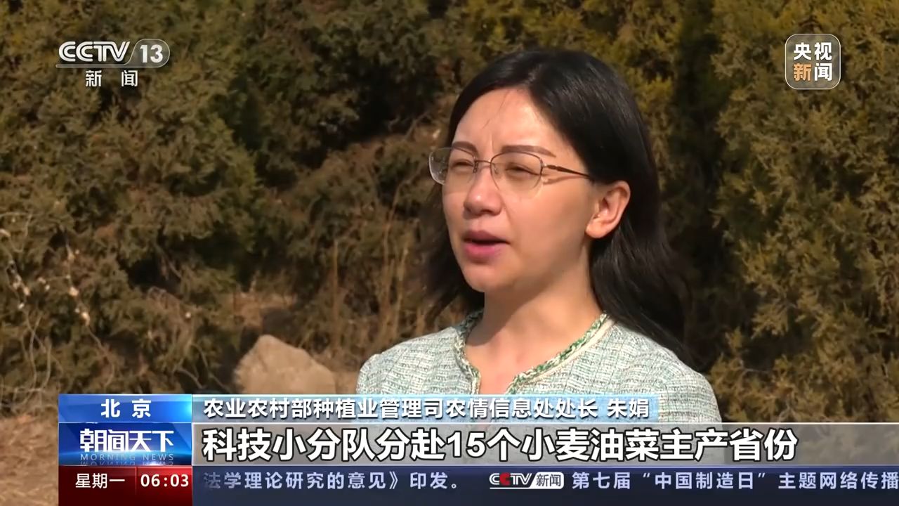 農(nóng)業(yè)農(nóng)村部種植業(yè)管理司農(nóng)情信息處處長 朱娟:科技小分隊分赴15個小麥油菜主產(chǎn)省份,包片蹲點,指導(dǎo)落實以“控旺促弱、抗旱防凍、防病治蟲”為重點的春季田管關(guān)鍵措施,全力以赴打贏夏糧豐收第一仗。(央視新聞客戶端)
