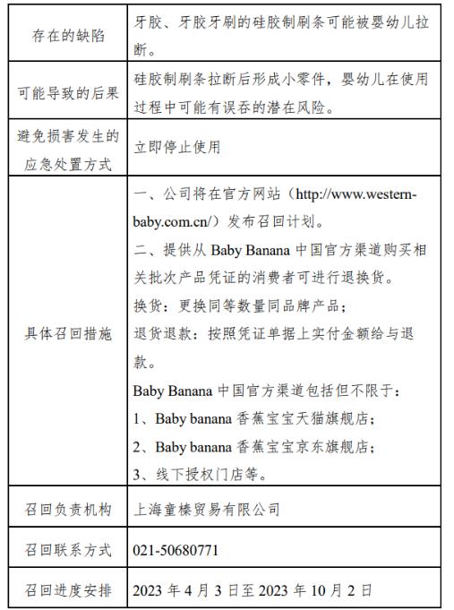 中新網(wǎng)4月3日電 據(jù)“上海市場(chǎng)監(jiān)管”微信公眾號(hào)3日消息,上海童榛貿(mào)易有限公司自2023年4月3日至2023年10月2日召回2010年1月至2022年8月生產(chǎn)的香蕉寶寶牌硅膠嬰兒牙膠、玉米硅膠嬰兒牙膠牙刷,共計(jì)983897件。