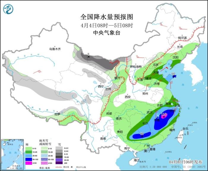 4月4日08時(shí)至5日08時(shí),內(nèi)蒙古西部、新疆南疆盆地和東部、西藏北部和東部、西北地區(qū)中東部、川西高原北部等地部分地區(qū)有小雪或雨夾雪,其中,內(nèi)蒙古西北部、新疆東部等地部分地區(qū)有中到大雪(5~8毫米)。遼東半島、華北東部、山東半島、江南大部、華南北部等地部分地區(qū)有中到大雨,其中,山東東部、安徽南部、湖南南部、江西中東部、浙江西部、福建西北部、廣西東北部、廣東西北部等地部分地區(qū)有暴雨或大暴雨(100~110毫米)。內(nèi)蒙古中東部、東北地區(qū)、新疆南疆盆地、華北、江淮東部、江南東部等地部分地區(qū)有4~6級(jí)風(fēng)(見(jiàn)圖4)。渤海、渤海海峽將有7~9級(jí)、陣風(fēng)10級(jí)的偏北風(fēng),黃海中部和南部將有7~8級(jí)、陣風(fēng)9級(jí)的東南風(fēng),東海北部將有7~8級(jí)、陣風(fēng)9級(jí)的東南風(fēng)轉(zhuǎn)6~7級(jí)、陣風(fēng)8級(jí)的偏南風(fēng)。