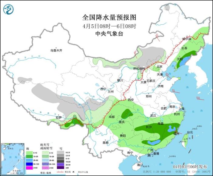 4月5日08時(shí)至6日08時(shí),內(nèi)蒙古西部、西藏北部和東部、青海南部、山西北部、河北北部、川西高原北部等地部分地區(qū)有小雪或雨夾雪。西藏東南部、東北地區(qū)東部、西南地區(qū)東部、江漢西部、江南、華南大部、臺(tái)灣島等地部分地區(qū)有小到中雨,其中,遼寧東南部、廣東中北部、福建中部等地部分地區(qū)有大雨,局部有暴雨。內(nèi)蒙古中西部等地部分地區(qū)有4~6級(jí)風(fēng)(見(jiàn)圖5)。