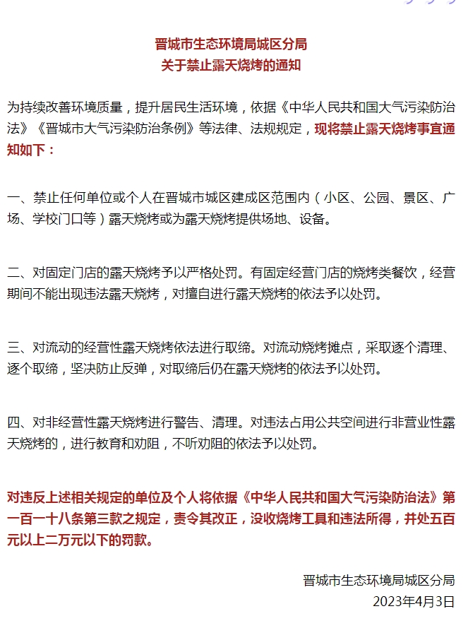 中新網(wǎng)4月10日電 據(jù)山西省晉城市生態(tài)環(huán)境局微信公眾號(hào)消息,晉城市生態(tài)環(huán)境局城區(qū)分局10日發(fā)布關(guān)于禁止露天燒烤的通知。通知要求: