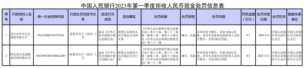 2023年第一季度,人民銀行依法對昌吉州華興生態(tài)旅游有限公司、阿克蘇市禾潤物業(yè)管理有限公司等2家拒收人民幣現(xiàn)金的單位及相關(guān)責(zé)任人作出經(jīng)濟(jì)處罰。