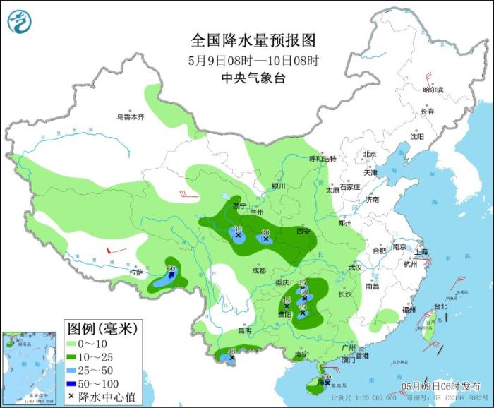 全國降水量預(yù)報(bào)圖(5月9日08時(shí)-10日08時(shí))