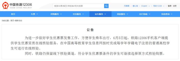 同時(shí),鐵路仍保留線下核驗(yàn)渠道,符合學(xué)生優(yōu)惠票條件的學(xué)生可繼續(xù)選擇原方式核驗(yàn)購票。