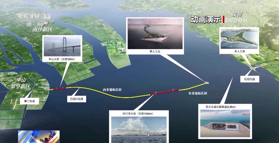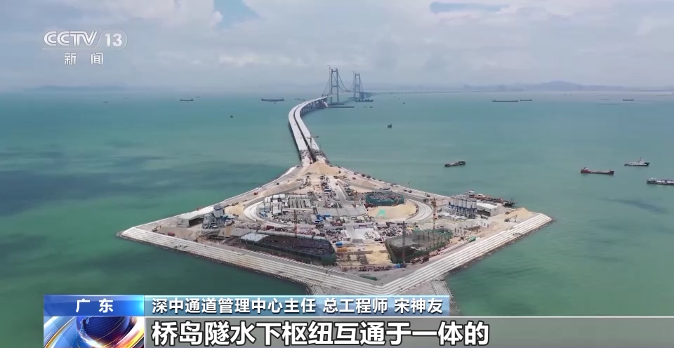 深中通道管理中心主任、總工程師 宋神友:未來,珠江西岸的人跟深圳機(jī)場以及前海實(shí)現(xiàn)快速交通轉(zhuǎn)換,就是通過在東岸設(shè)置了一個(gè)高速公路水下樞紐互通立交的形式,所以最終這個(gè)項(xiàng)目就是采用了橋島隧水下樞紐互通于一體的跨海集群工程。