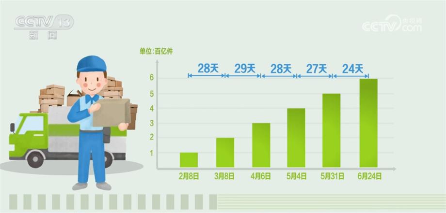 今年以來,從2月8日我國(guó)快遞業(yè)務(wù)量超100億件起,每個(gè)月快遞業(yè)務(wù)量都以百億件為增量。28天,快遞業(yè)務(wù)量從100億件到200億件(3月8日),29天達(dá)300億件(4月6日),28天從300億件到400億件(5月4日),27天達(dá)500億件(5月31日),從500億件到600億件(6月24日)只花了24天。