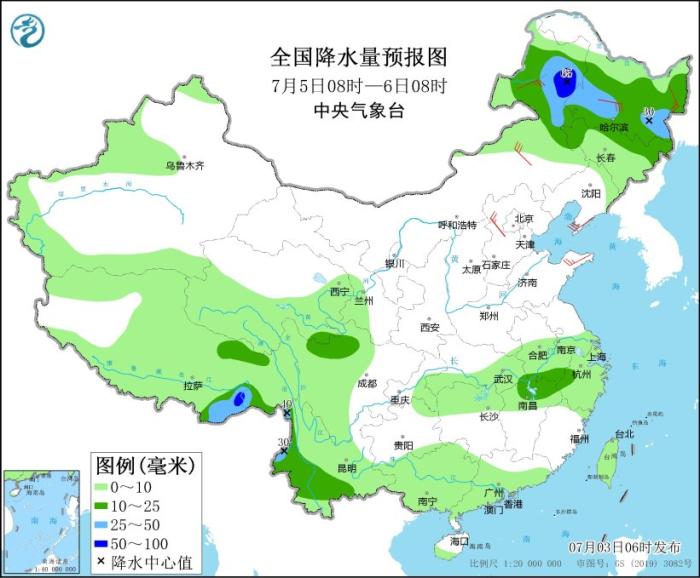 7月4日08時(shí)至5日08時(shí),內(nèi)蒙古東部、黑龍江南部、吉林、遼寧以及蘇皖南部、湖北西南部、湖南北部、廣東南部、廣西北部和西部、云南大部、西藏東南部等地部分地區(qū)有中到大雨,其中,內(nèi)蒙古東北部、黑龍江西南部、吉林中西部、遼寧中東部、西藏東南部等地部分地區(qū)有暴雨或大暴雨(100~120毫米)。內(nèi)蒙古、華北北部和西部、黃淮東部、東北地區(qū)南部等地部分地區(qū)有4~6級風(fēng)。