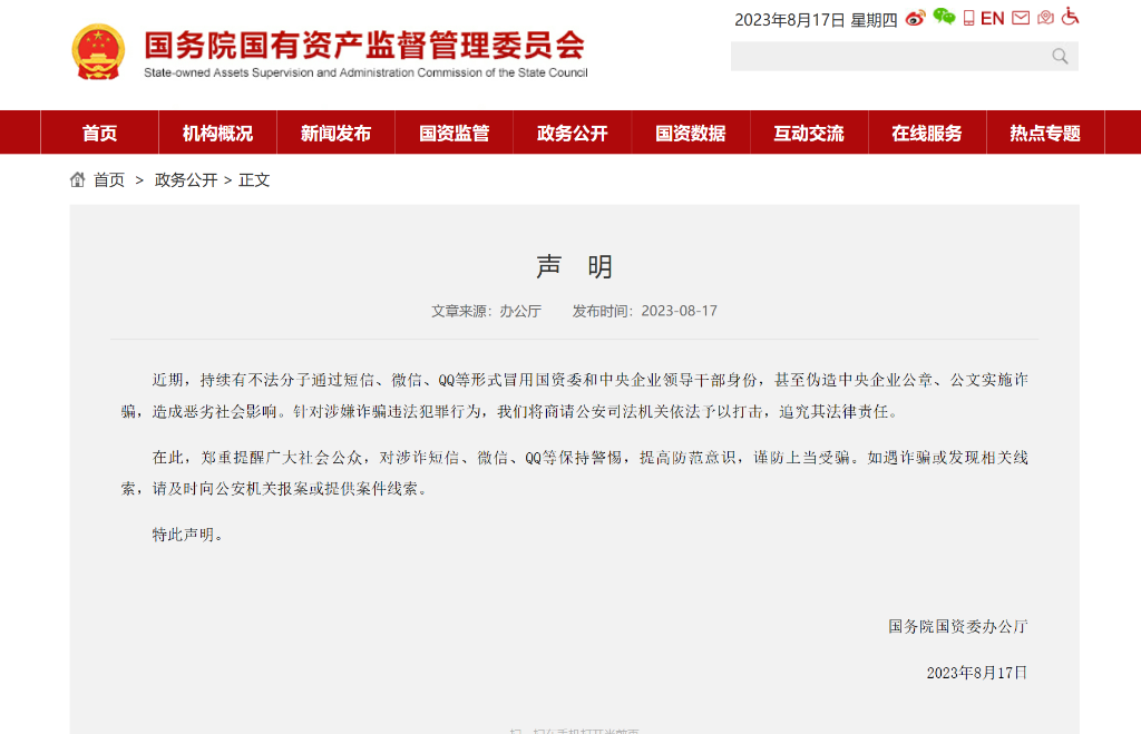 國務(wù)院國資委辦公廳8月17日在國務(wù)院國資委官網(wǎng)發(fā)布聲明稱,近期,持續(xù)有不法分子通過短信、微信、QQ等形式冒用國務(wù)院國資委和中央企業(yè)領(lǐng)導(dǎo)干部身份,甚至偽造中央企業(yè)公章、公文實施詐騙,造成惡劣社會影響。針對涉嫌詐騙違法犯罪行為,國務(wù)院國資委將商請公安司法機關(guān)依法予以打擊,追究其法律責任。