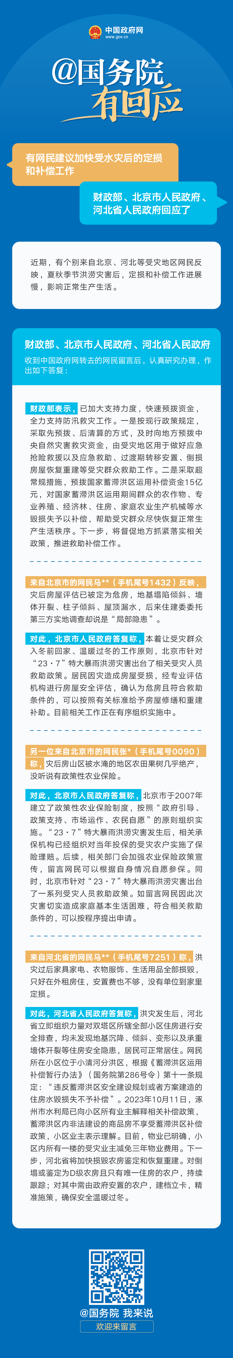 財(cái)政部、北京市人民政府、河北省人民政府答網(wǎng)民關(guān)于“建議加快受水災(zāi)后的定損和補(bǔ)償工作”的留言