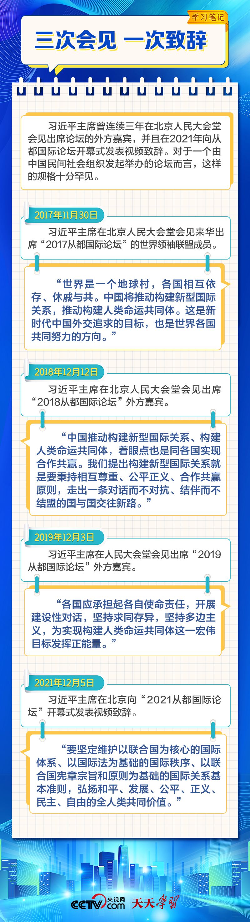 天天學(xué)習(xí) 12月4日,習(xí)近平主席在致“2023從都國際論壇”的賀信中強調(diào),面對前所未有的世界之變、時代之變和歷史之變,人類社會必須團(tuán)結(jié)起來,堅持互學(xué)互鑒、開放包容、合作共贏,弘揚全人類共同價值,共同建設(shè)更加美好的世界。