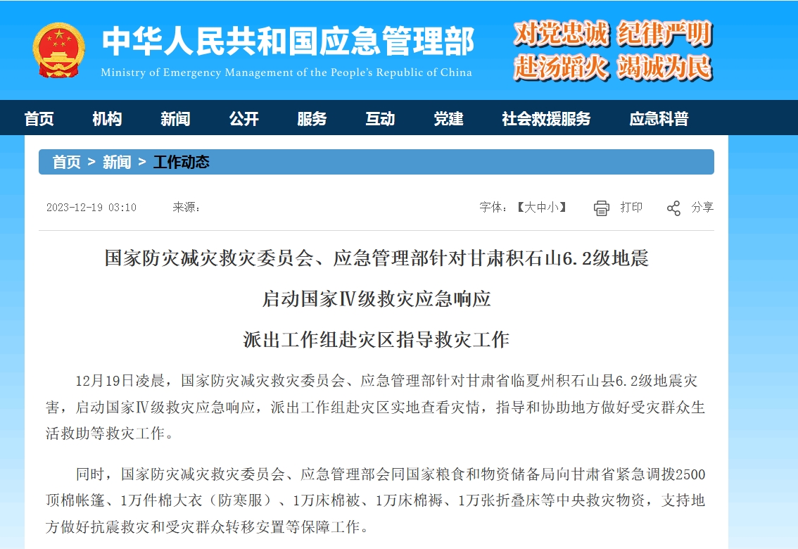 中新網(wǎng)12月19日電 據(jù)應(yīng)急管理部網(wǎng)站消息,12月19日凌晨,國家防災(zāi)減災(zāi)救災(zāi)委員會、應(yīng)急管理部針對甘肅省臨夏州積石山縣6.2級地震災(zāi)害,啟動國家Ⅳ級救災(zāi)應(yīng)急響應(yīng),派出工作組赴災(zāi)區(qū)實(shí)地查看災(zāi)情,指導(dǎo)和協(xié)助地方做好受災(zāi)群眾生活救助等救災(zāi)工作。
