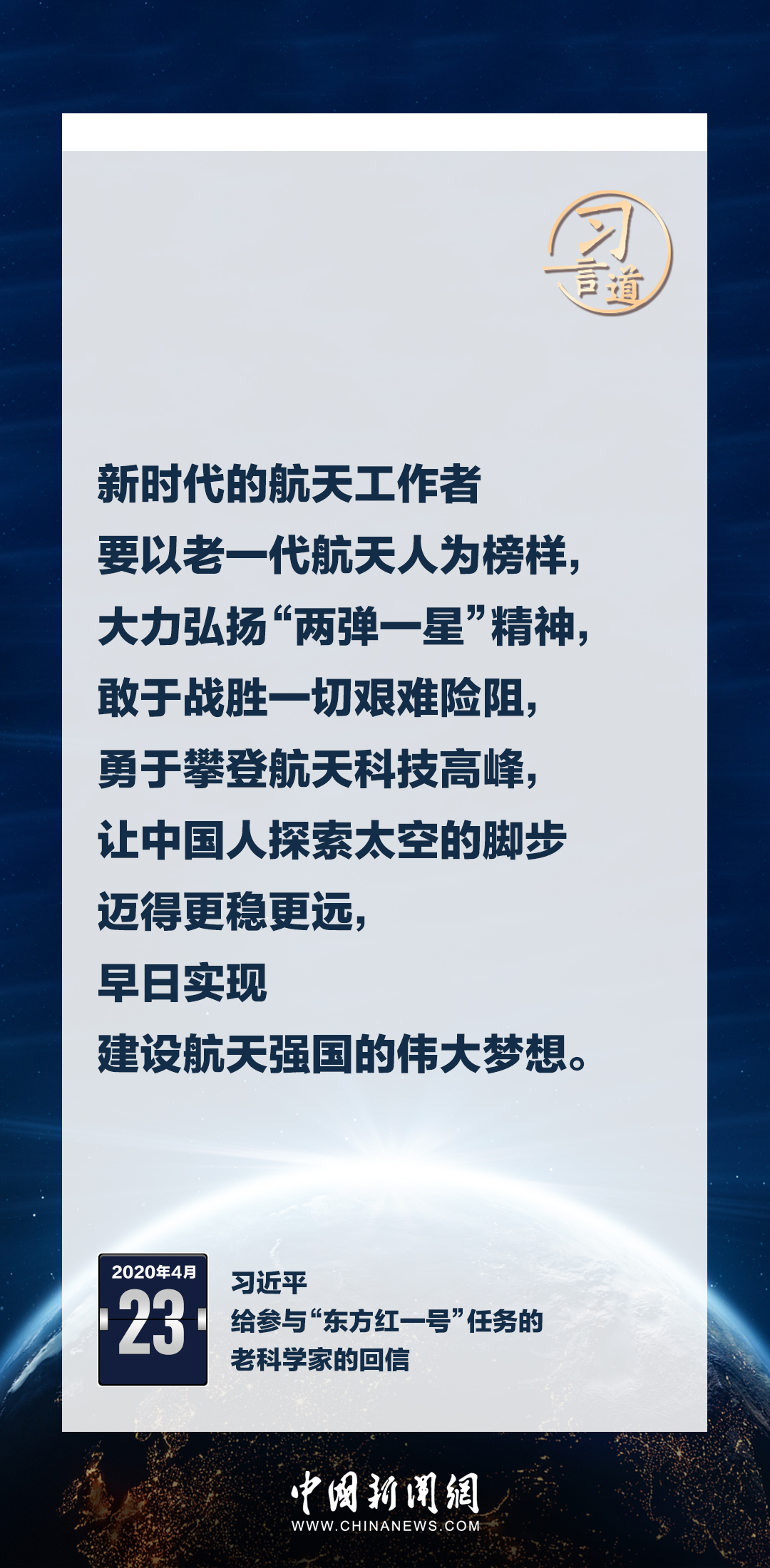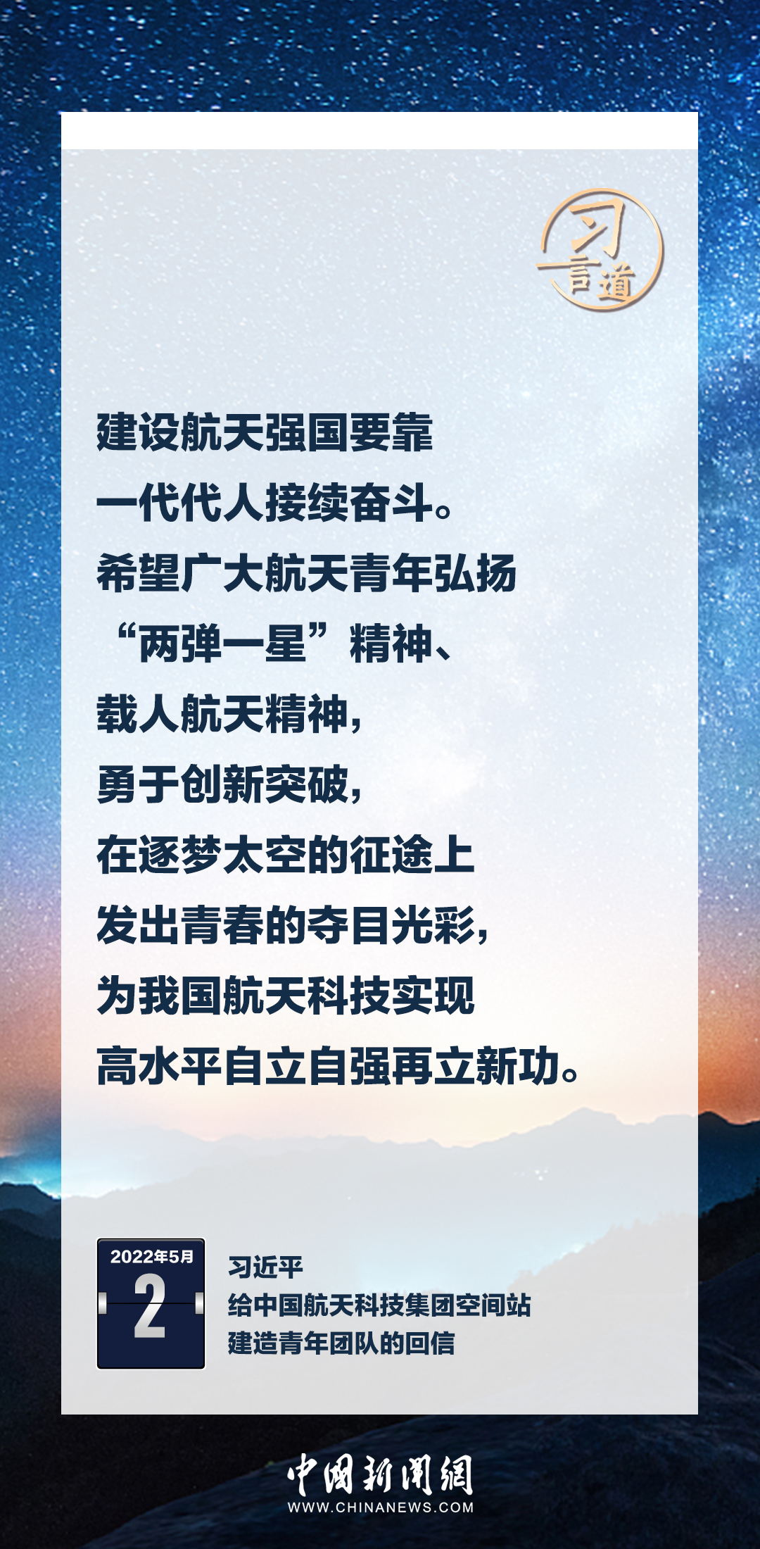 建設(shè)航天強(qiáng)國要靠一代代人接續(xù)奮斗。在不同場合,習(xí)近平總書記頻頻提及航天精神,激勵一代代中國人不斷奮進(jìn)、筑夢太空。