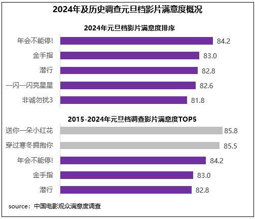 中國(guó)電影觀眾滿意度調(diào)查 2024年元旦檔調(diào)查結(jié)果顯示,元旦檔電影觀眾滿意度得分83.0分,環(huán)比增長(zhǎng)0.2分。檔期以多元化且高契合度的影片供給陪伴觀眾跨年,得到了較高的滿意度評(píng)價(jià),5部影片中有4部進(jìn)入歷史調(diào)查19部元旦檔影片的滿意度前十,喜劇《年會(huì)不能停!》以84.2分領(lǐng)銜,《金手指》83.0分居第二位,《潛行》《一閃一閃亮星星》均超82分,《非誠(chéng)勿擾3》超81分。