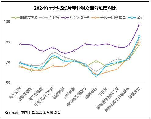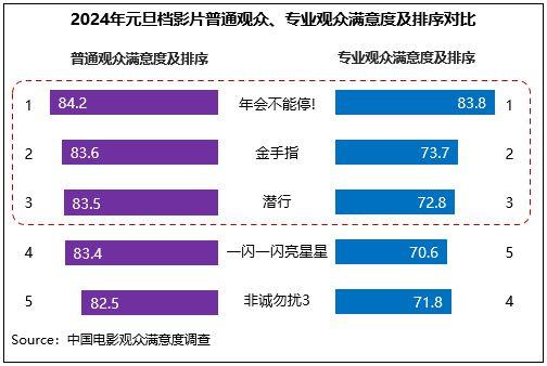 2024年元旦檔調(diào)查的5部影片中,單片滿意度前三的影片在普通觀眾和專(zhuān)業(yè)觀眾評(píng)價(jià)中的排序保持一致,而居單片滿意度后兩位的影片排序則有所差異,展現(xiàn)出不同細(xì)分觀眾群體的觀影審美差異。