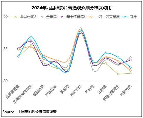以90后為主要?jiǎng)?chuàng)作班底的《一閃一閃亮星星》在影片內(nèi)容題材和宣發(fā)方式上都營(yíng)造出足夠的跨年氛圍感,滿意度82.6分;《非誠(chéng)勿擾3》攜原班陣容回歸,影片在以貼合當(dāng)下的AI議題和多巴胺視覺(jué)之下,繼續(xù)探索生活經(jīng)歷和人生意義,滿意度81.8分。