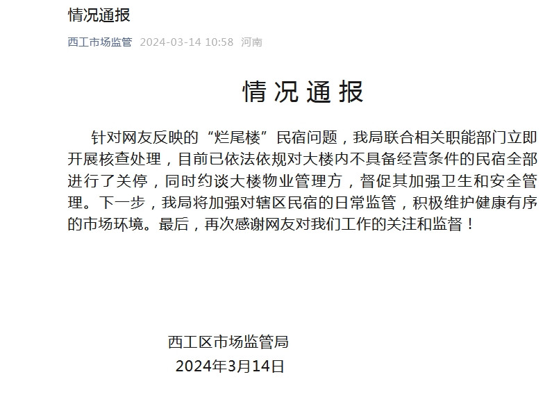 針對網(wǎng)友反映的“爛尾樓”民宿問題,西工區(qū)市場監(jiān)管局聯(lián)合相關(guān)職能部門立即開展核查處理,目前已依法依規(guī)對大樓內(nèi)不具備經(jīng)營條件的民宿全部進(jìn)行了關(guān)停,同時約談大樓物業(yè)管理方,督促其加強(qiáng)衛(wèi)生和安全管理。