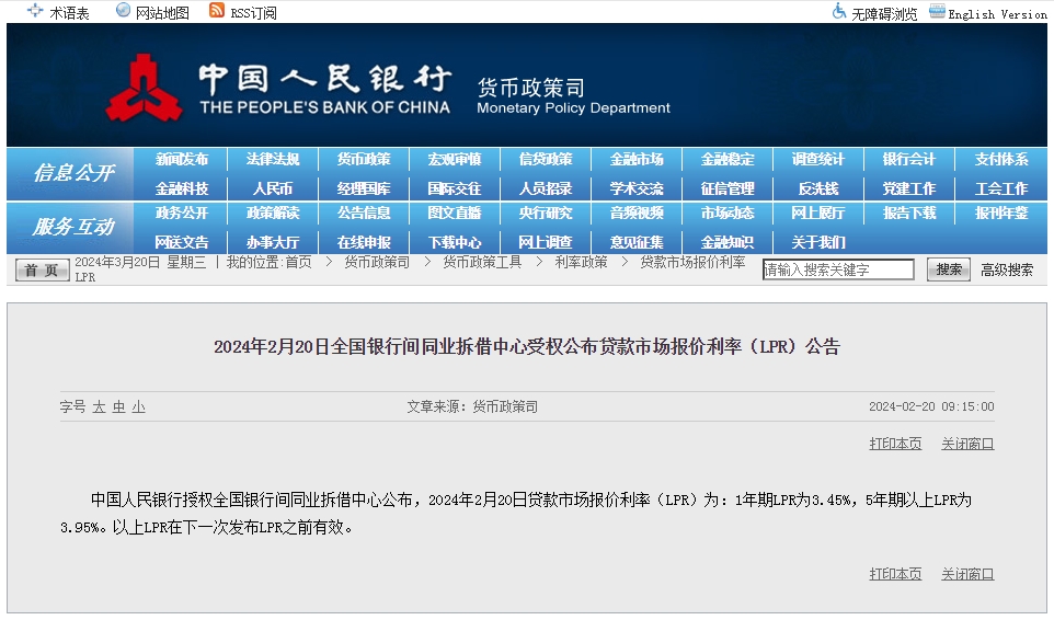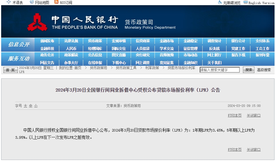 中新網3月20日電 據中國人民銀行網站消息,中國人民銀行授權全國銀行間同業(yè)拆借中心公布,2024年3月20日貸款市場報價利率(LPR)為:1年期LPR為3.45%,5年期以上LPR為3.95%。以上LPR在下一次發(fā)布LPR之前有效。3月LPR與2月保持一致,未作調整。