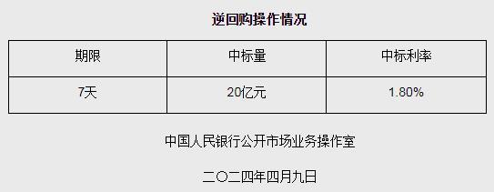 中新網(wǎng)4月9日電 據(jù)中國人民銀行網(wǎng)站消息,為維護銀行體系流動性合理充裕,2024年4月9日人民銀行以利率招標方式開展了20億元逆回購操作。具體情況如下: