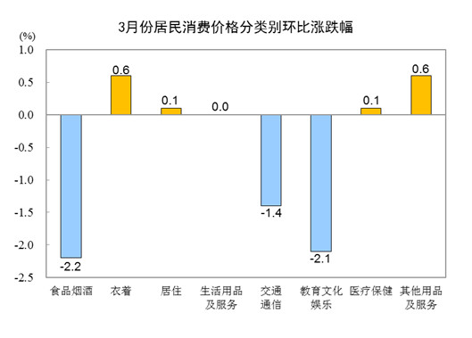 3月份,全國居民消費價格環(huán)比下降1.0%。其中,城市下降1.0%,農(nóng)村下降0.7%;食品價格下降3.2%,非食品價格下降0.5%;消費品價格下降0.9%,服務(wù)價格下降1.1%。