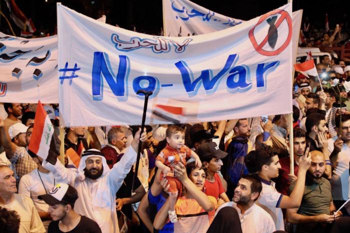 2019年5月24日,在伊拉克首都巴格達(dá),民眾在集會上舉著反戰(zhàn)橫幅。新華社發(fā)(哈利勒·達(dá)伍德攝)