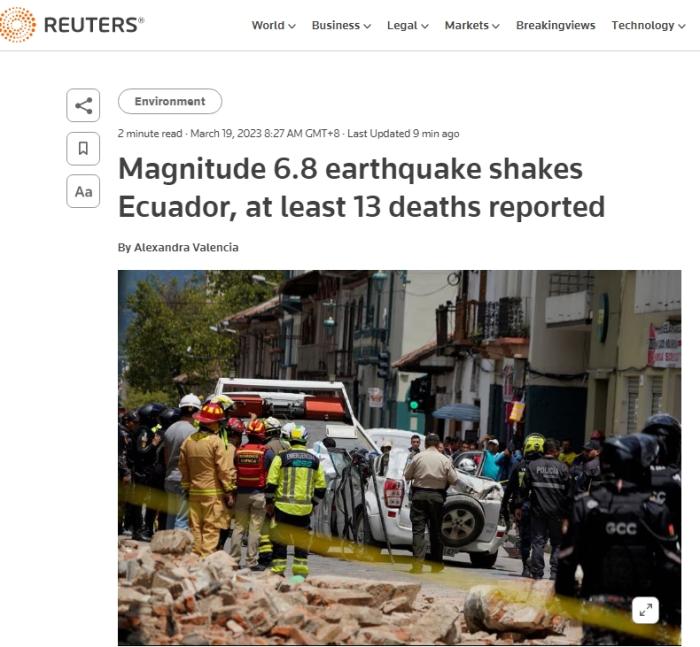 中新網(wǎng)3月19日 綜合外媒報道,當?shù)貢r間18日約12時,厄瓜多爾發(fā)生6.8級地震,造成至少14人遇難,超過380人受傷,多處房屋、學校和醫(yī)療中心遭到結(jié)構(gòu)性破壞。