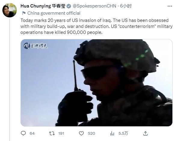 華春瑩在第一條推文中轉(zhuǎn)發(fā)了關(guān)于美國發(fā)動(dòng)伊拉克戰(zhàn)爭的一個(gè)調(diào)查視頻,并配文稱,“今天是美國入侵伊拉克20周年。美國一直沉迷于軍事建設(shè)、戰(zhàn)爭和破壞。美國的‘反恐’軍事行動(dòng)已造成90萬人死亡?!?/p>