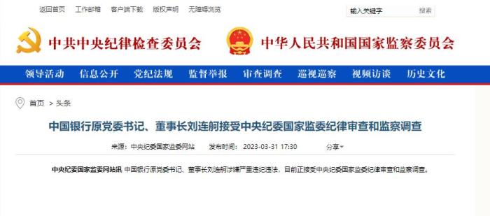 據(jù)中央紀(jì)委國家監(jiān)委網(wǎng)站3月31日消息,中國銀行原黨委書記、董事長(zhǎng)劉連舸涉嫌嚴(yán)重違紀(jì)違法,目前正接受中央紀(jì)委國家監(jiān)委紀(jì)律審查和監(jiān)察調(diào)查。