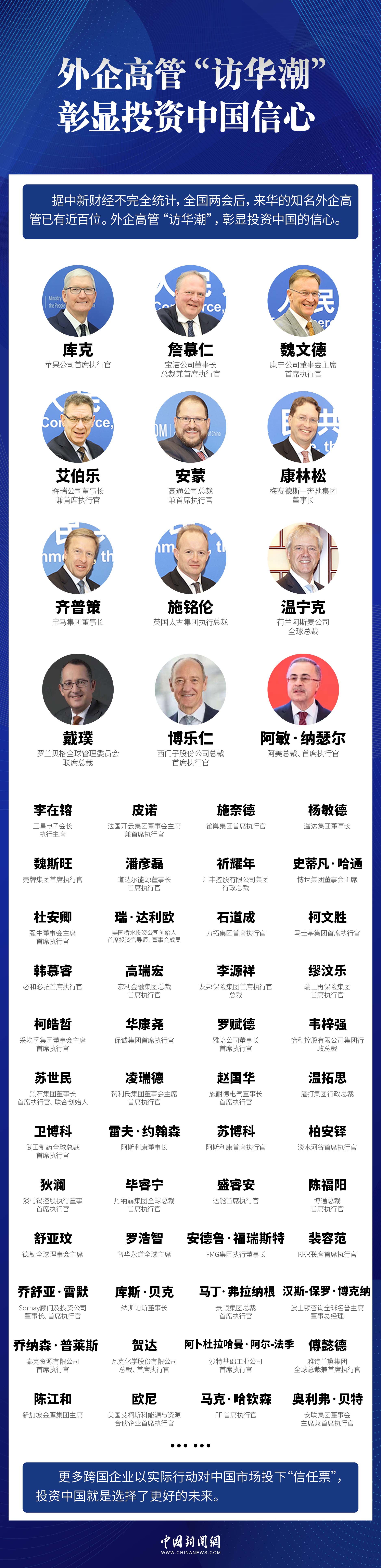 中新網(wǎng)北京4月7日電 (記者 李金磊)時(shí)下,外企高管正掀起“訪華潮”。據(jù)中新財(cái)經(jīng)不完全統(tǒng)計(jì),全國兩會(huì)后,來華的知名外企高管已有近百位。