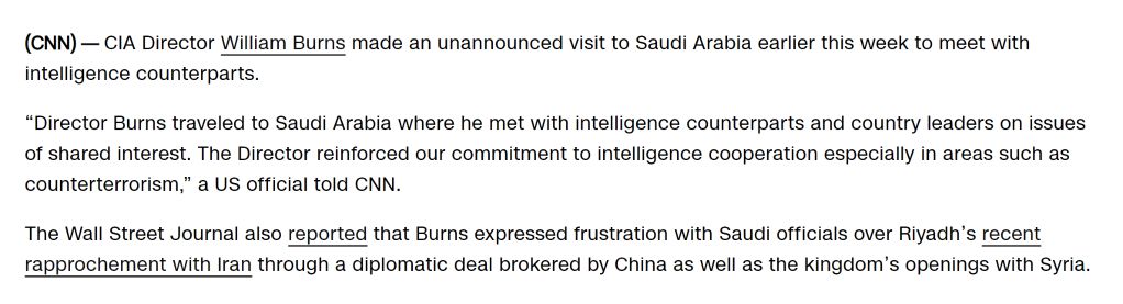 據(jù)美國有線電視新聞網(wǎng)報道,伯恩斯與沙特高級官員討論了“共同利益”,包括情報合作和反恐等問題?!度A爾街日報》文章稱,伯恩斯對沙特接受中國斡旋與伊朗復交、沙特與敘利亞走近等表示“失望”“錯愕”,重申伊朗和敘利亞仍處于美國的制裁中。