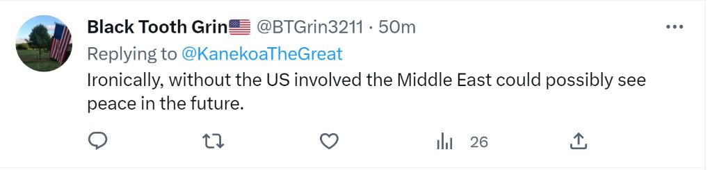 一名自我介紹是美國退役軍人的網(wǎng)友“現(xiàn)身說法”:“真諷刺,沒有美國摻和,中東或許未來就會實現(xiàn)和平。
