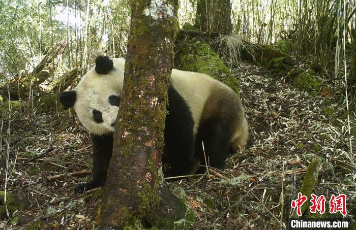 野生大熊貓“磨皮擦癢”?!〈笮茇垏夜珗@石棉片區(qū) 供圖