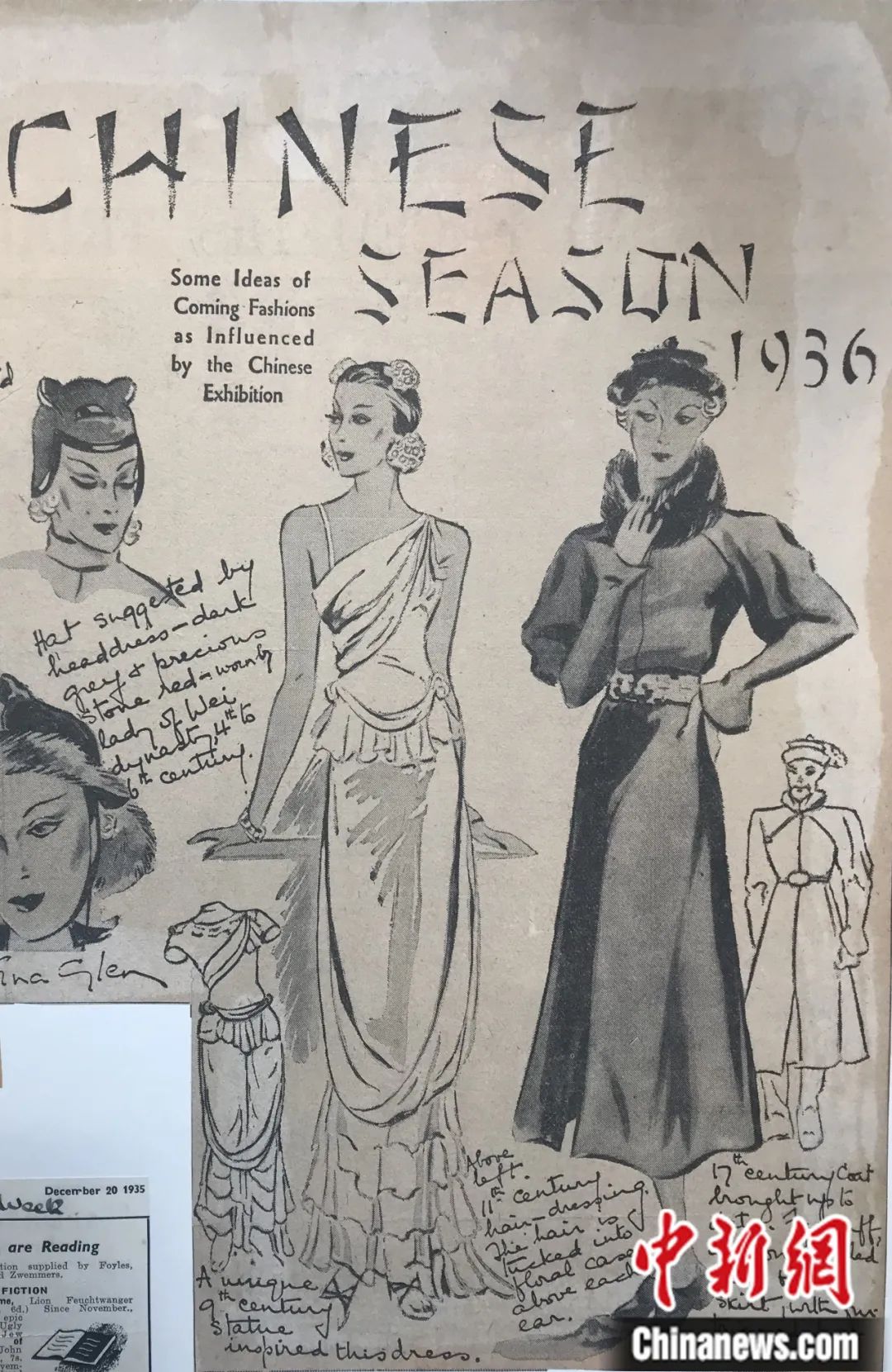 展覽開幕前,Vogue雜志于1935年10月30日用一整版的篇幅,梳理預(yù)測(cè)了中國(guó)佛像的衣紋裝飾以及陶瓷的花紋色彩,即將對(duì)時(shí)尚帶來的一些影響。倫敦藝展開幕后,歐洲時(shí)尚設(shè)計(jì)師陸續(xù)趕赴伯靈頓宮參觀展覽,希望從中找尋時(shí)尚設(shè)計(jì)的靈感。一條春季時(shí)尚長(zhǎng)裙的設(shè)計(jì)靈感,來源于展覽中的一座唐代漢白玉菩薩立姿像。佛像婀娜娉婷的身姿、華美精致的瓔珞以及輕薄柔軟的長(zhǎng)裙,深深吸引著設(shè)計(jì)師的目光。